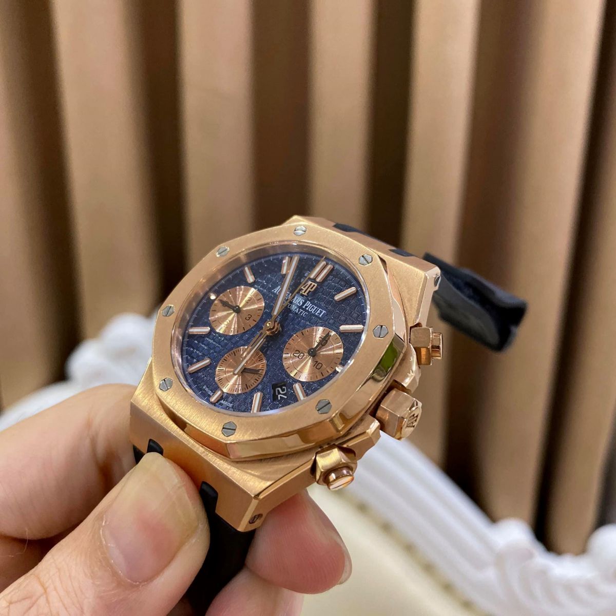 Đồng hồ Audemars Piguet Royal Oak Chonograp 26239 chế tác rose gold 18k được sản xuất trực tiếp tại thủ phủ Hồng Kông, nơi có các nhà máy lớn, hiện đại, có các nghệ nhân lão luyện hàng đầu. Đồng hồ làm từ vàng 18k nguyên khối như hàng hãng. Đồng hồ được đi kèm là hộp sổ thẻ như hãng và giấy kiểm định vàng và kim cương từ các trung tâm kiểm định uy tín như DOJI và GIV. Khách hàng có thể kiểm định lại ở bất cứ đâu nếu không phải vàng chúng tôi sẽ đền tiền gấp đôi.