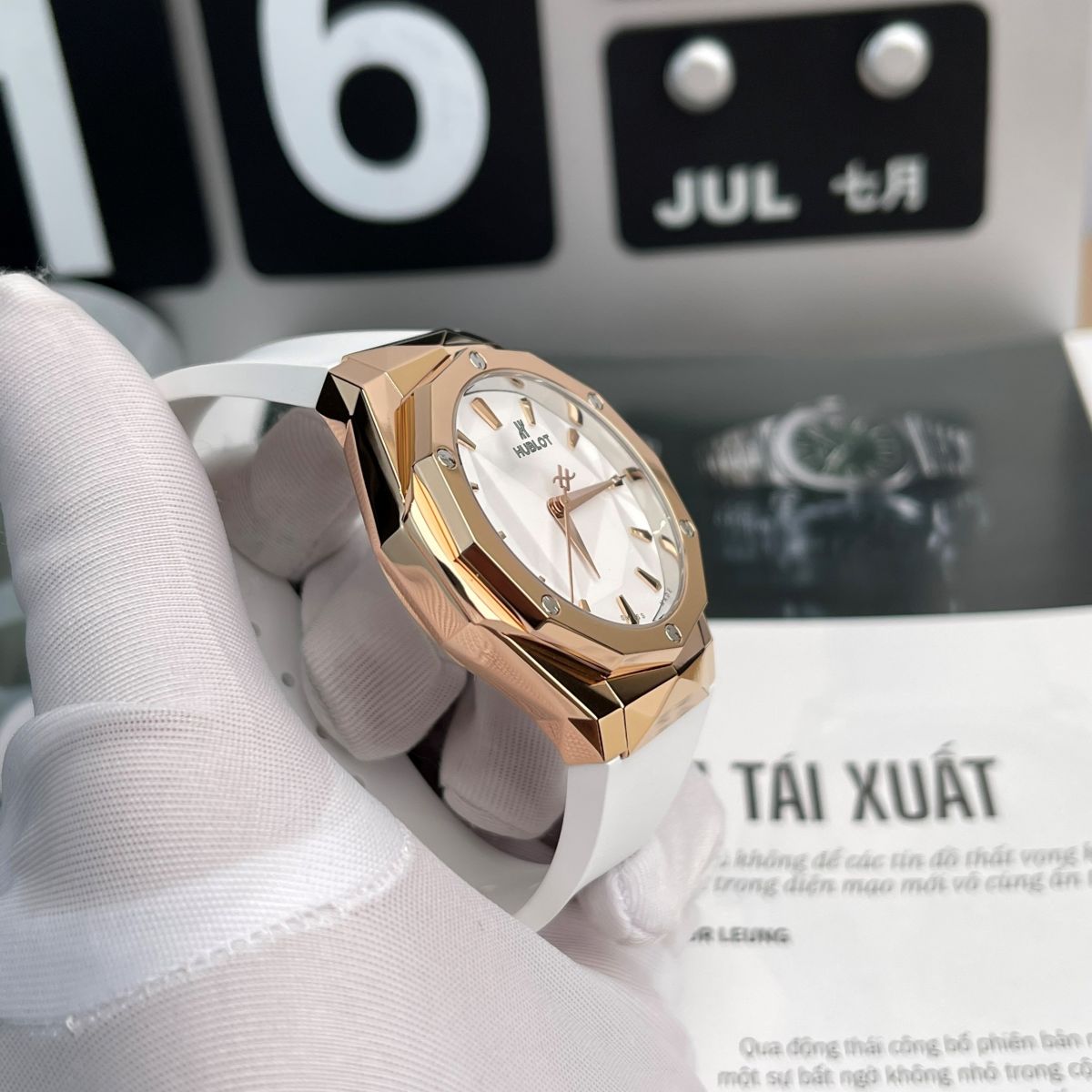 Mua đồng hồ Hubot replica ở đâu tin cậy đến với KARAT bạn sẽ bất ngờ khi bắt gặp phiên bản Đồng hồ Hublot Classic Fusion Orlinski King Gold 550. Để làm nổi bật lên sắc vàng của vành bezel, sản phẩm đã lựa chọn sắc trắng cho mặt số và dây đeo. Nhằm khắc phục tình trạng dễ bám bẩn dây đeo, nhà sản xuất đã dùng lớp tráng chuyên dụng.