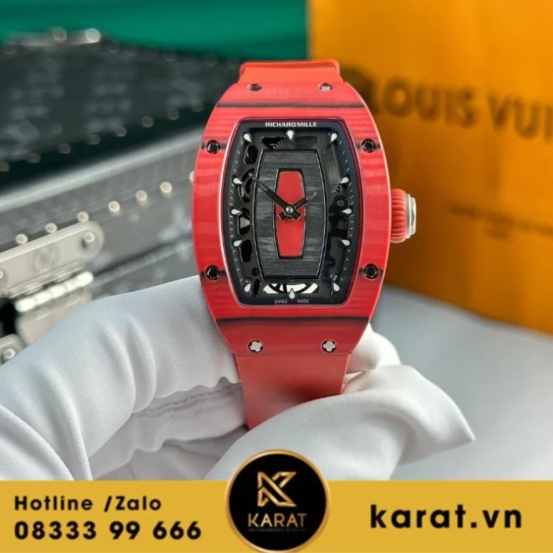 RM 07-01 Red Carbon chế tác là một trong những mẫu đồng hồ nữ nổi bật nhất trong dòng RM, sở hữu sắc đỏ carbon cuốn hút và phong cách hiện đại. Phiên bản Replica 1:1 tại Karat.vn được hoàn thiện tỉ mỉ, tái hiện chuẩn form dáng và độ tinh xảo, mang đến trải nghiệm đeo sang trọng và đầy cá tính cho phái đẹp.