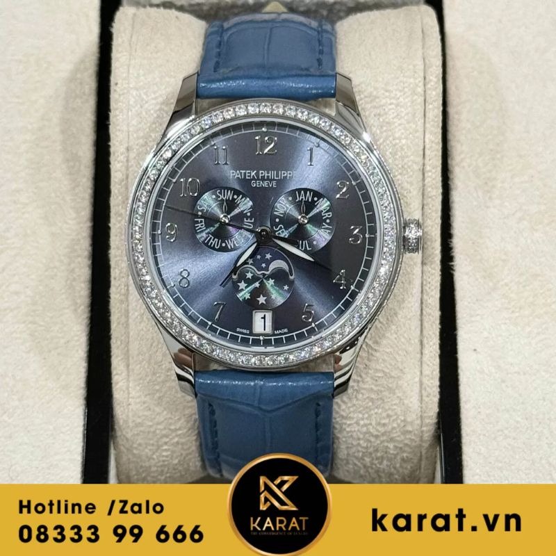 Mặt số xanh navy sang trọng là điểm nhấn khó cưỡng, kết hợp hoàn hảo cùng bộ kim dauphine mảnh mai. Các cọc số đính đá tinh xảo cùng cửa sổ lịch kép ở vị trí 3h và 9h tạo nên sự cân đối, dễ đọc. Logo Patek Philippe Genève đặt nổi bật dưới vị trí 12h – biểu tượng của đẳng cấp Thụy Sĩ.