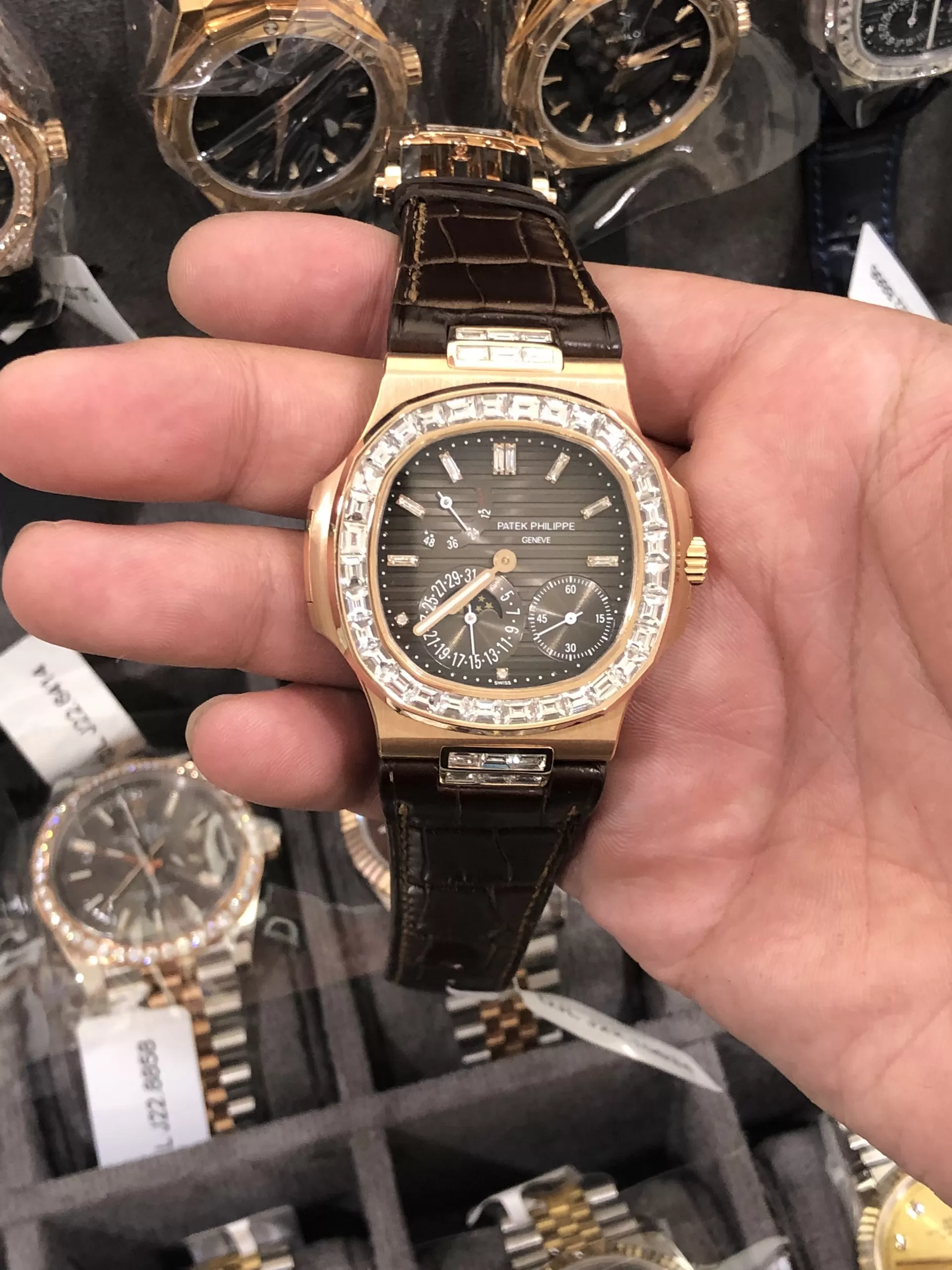 Đồng hồ patek philippe Super Fake sở hữu bộ vỏ rose gold 18K đường kính 40mm chắc chắn, bezel cố định đính 44 viên baguette diamonds lấp lánh, độ bền vượt trội và cảm giác xa xỉ tinh tế.