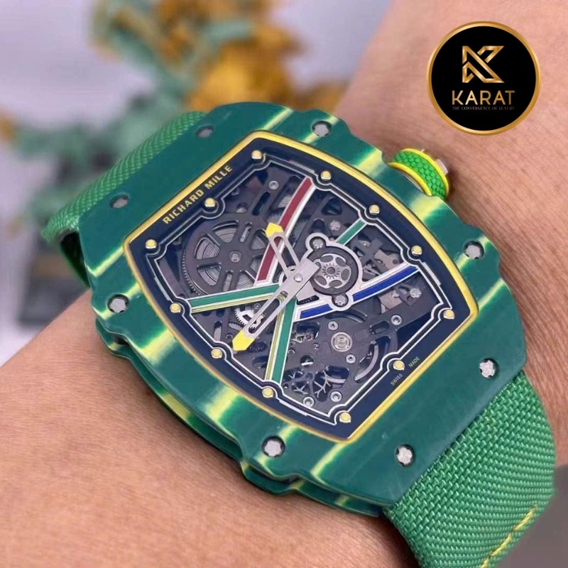 Chiếc RM67-02 sở hữu vỏ carbon xanh TPT – chất liệu siêu nhẹ, bền bỉ và chống trầy xước vượt trội. Với độ dày chỉ 7.8mm, khung vỏ tonneau ôm sát cổ tay, tạo cảm giác thoải mái nhưng cực kỳ sang trọng. Các vân carbon xen kẽ sắc xanh tạo hiệu ứng thị giác mạnh mẽ, biểu tượng cho tinh thần thể thao đỉnh cao.