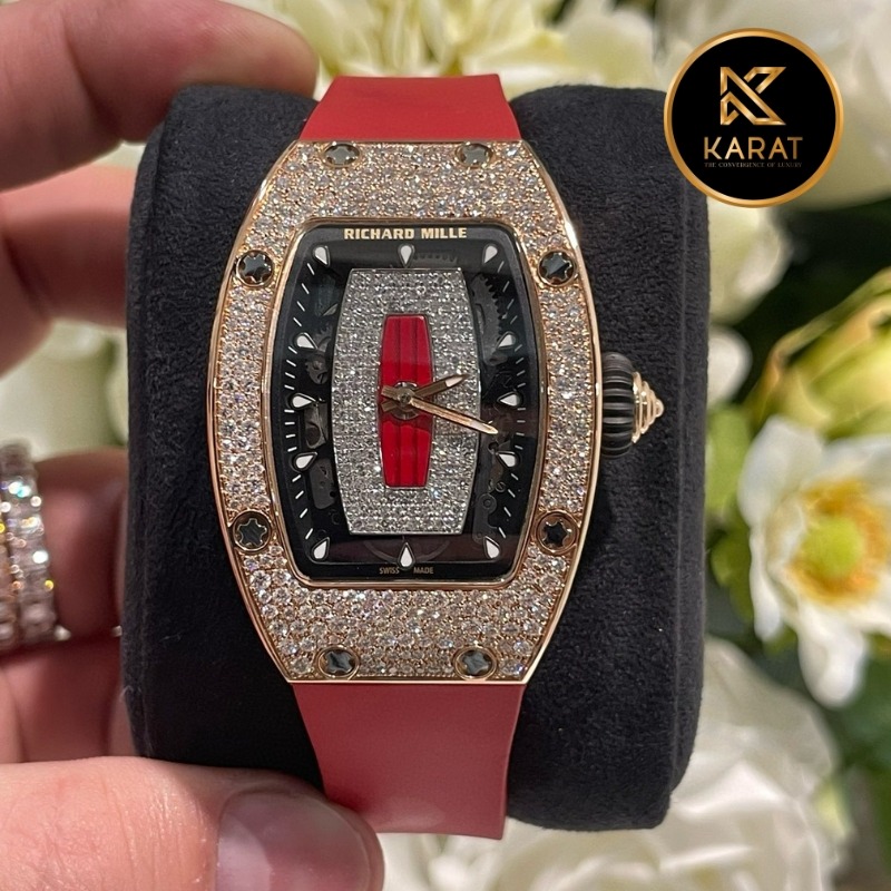 Đồng hồ Richard Mille RM07-01 Replicalà biểu tượng của vẻ đẹp thanh lịch pha lẫn cá tính hiện đại, được thiết kế dành riêng cho quý cô yêu phong cách khác biệt. Sự kết hợp tinh tế giữa vàng khối, kim cương thiên nhiên và dây cao su đỏ mang đến vẻ đẹp sang trọng, trẻ trung mà vẫn giữ đậm DNA của RM. Cùng khám phá phiên bản chế tác cao cấp tại Karat.vn - đồng hồ chế tác cao cấp và trải nghiệm phong cách thời thượng dành riêng cho bạn.