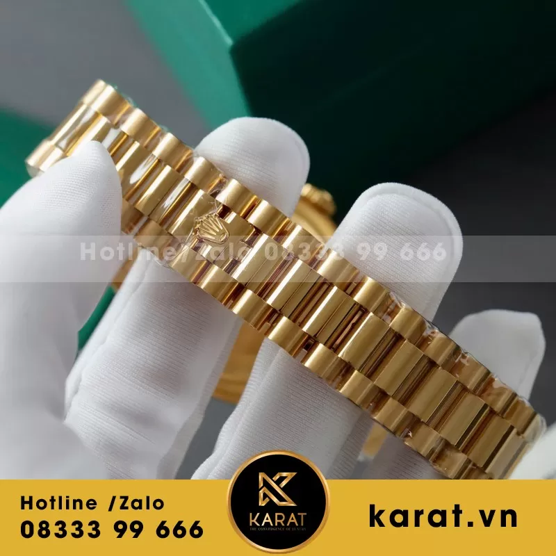 Dây đeo President 3 mắt xích bọc vàng thật 18K, mềm mại ôm sát cổ tay suốt ngày với khóa gập ẩn an toàn. Thiết kế thoải mái, dễ điều chỉnh, dây đeo nâng tầm sự thanh lịch, phù hợp với trang phục đa dạng.