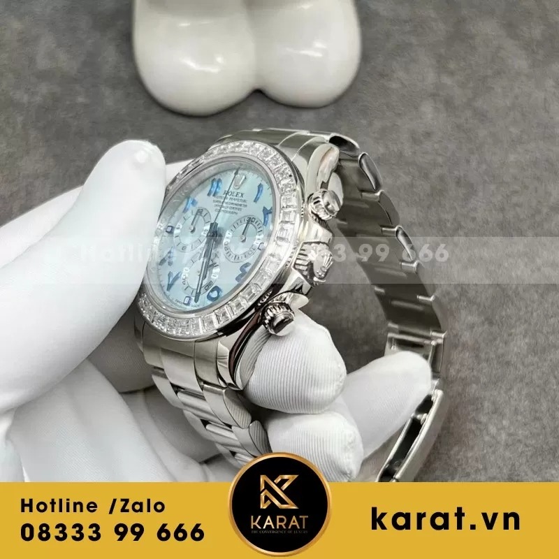 Điểm nhấn nổi bật nhất chính là mặt số xanh băng (Ice Blue) độc quyền cho chất liệu platinum, kết hợp cọc số Arabic phá cách cùng ba mặt subdial chronograph cân đối. Vành bezel đính kim cương thiên nhiên Baguette tỏa sáng lấp lánh, nâng tầm thẩm mỹ vượt thời gian.