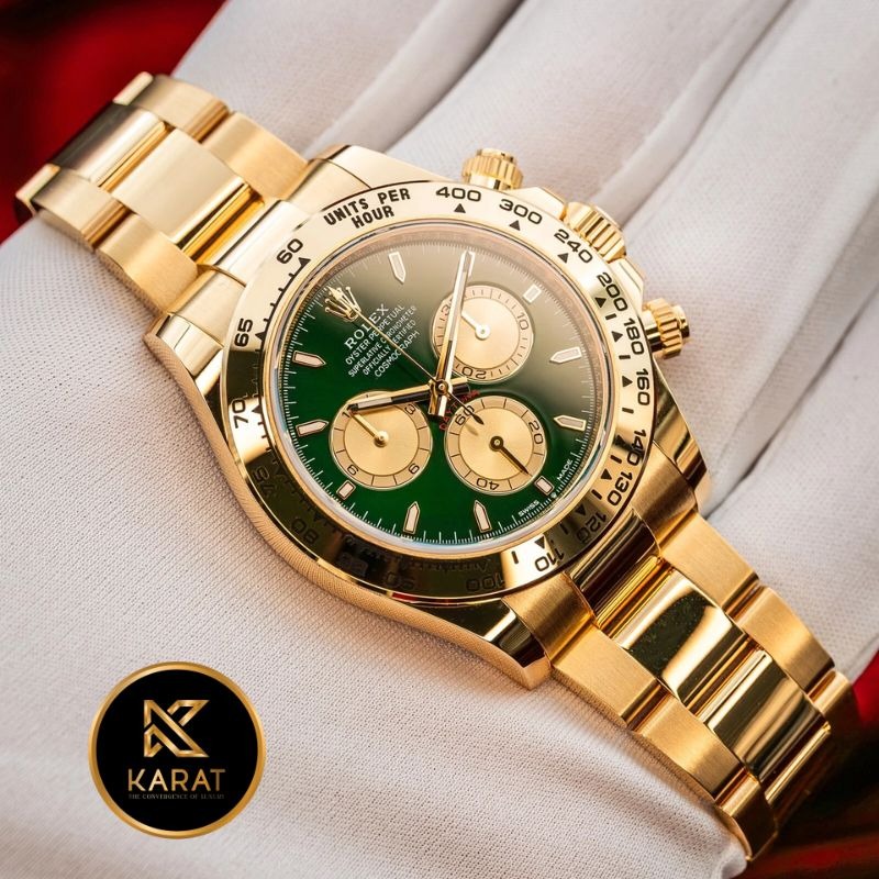Mặt số xanh Green đặc trưng, kim giờ và cọc số vàng nổi bật với lớp phủ dạ quang, dễ quan sát trong mọi điều kiện ánh sáng. Đồng hồ trang bị đầy đủ chức năng Chronograph, ô hiển thị ngày tiện dụng và thiết kế cân đối, vừa hiện đại vừa tinh tế, thể hiện kỹ nghệ chế tác đỉnh cao của Rolex.