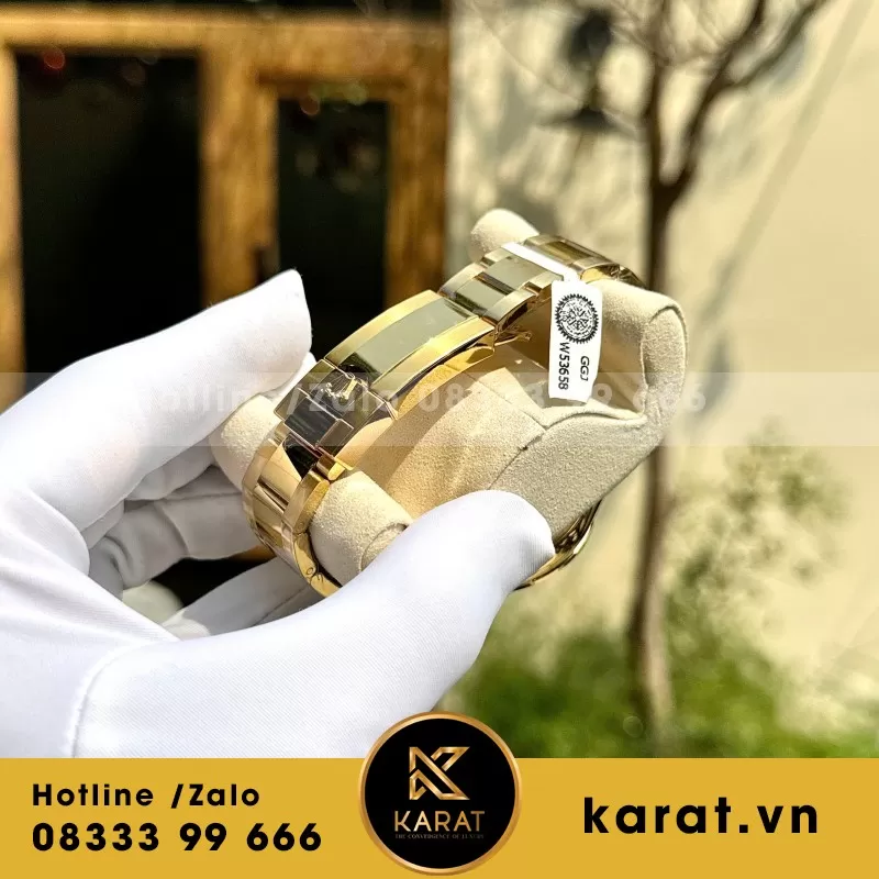 Dây Oyster bọc vàng thật chắc chắn, được hoàn thiện bằng kỹ thuật đánh bóng tinh vi, vừa sang trọng vừa bền bỉ. Cơ chế khóa Oysterlock đặc trưng đảm bảo an toàn, đồng thời giữ cho đồng hồ ôm sát cổ tay một cách thoải mái.