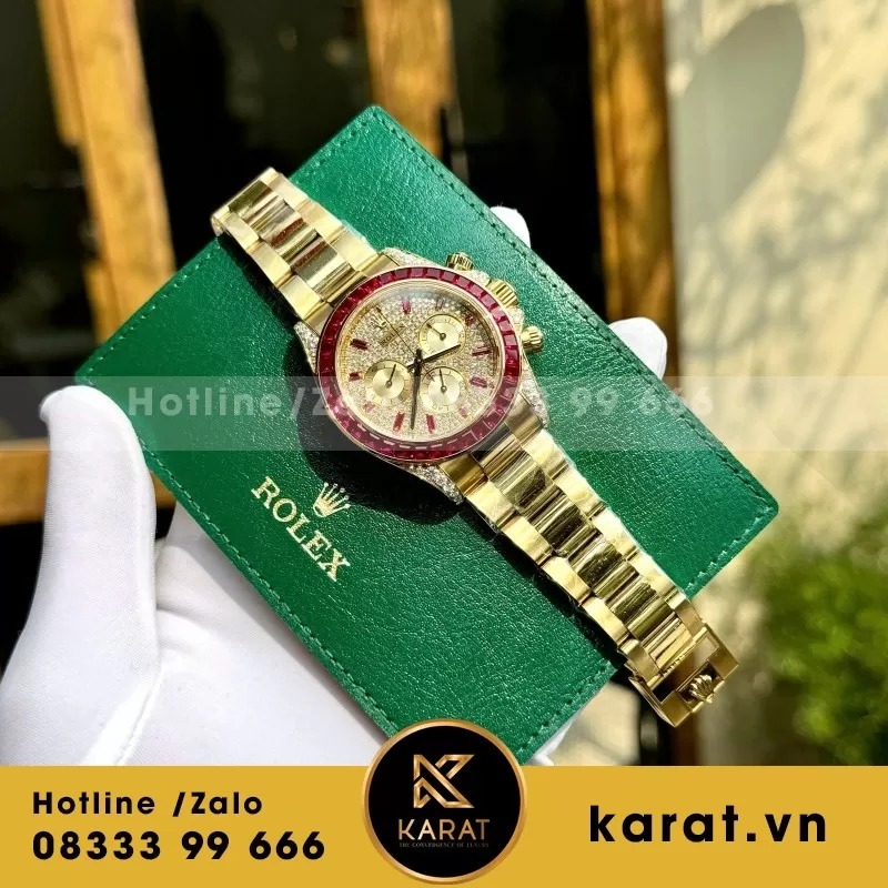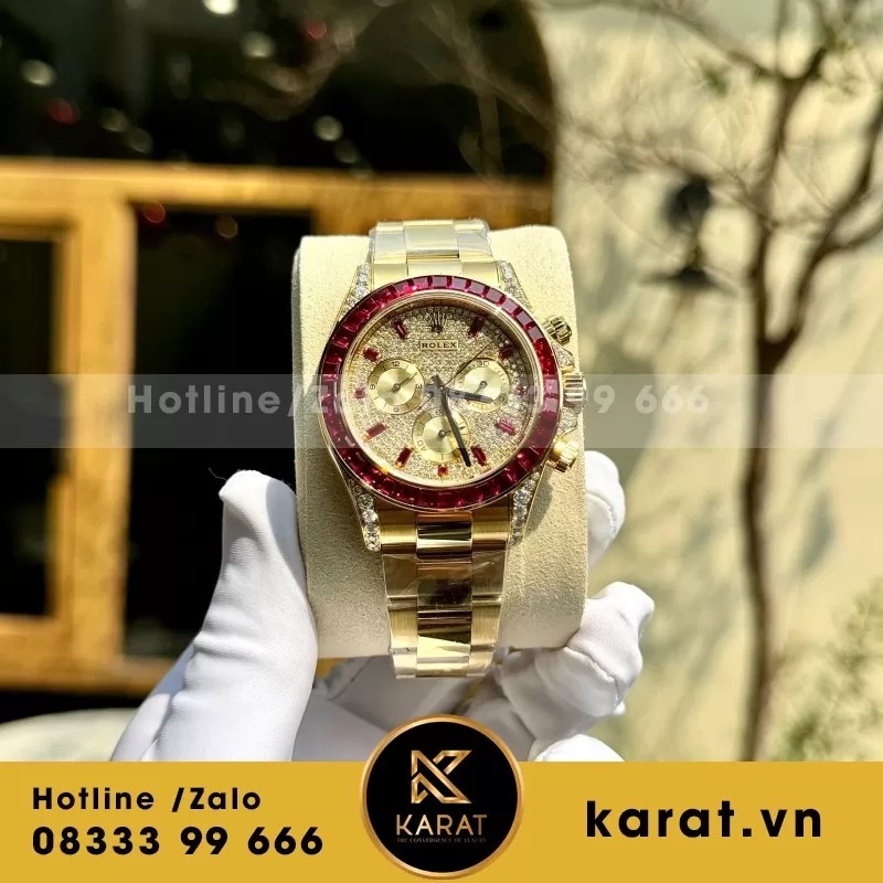 Đồng Hồ Rolex Daytona 126598TRU là đỉnh cao của sự sang trọng – nơi Ruby, vàng thật và kim cương Moissanite gặp gỡ trong một thiết kế hoàn mỹ. Để chiêm ngưỡng và sở hữu tuyệt phẩm đồng hồ rolex rep, hãy truy cập Karat.vn ngay hôm nay.
