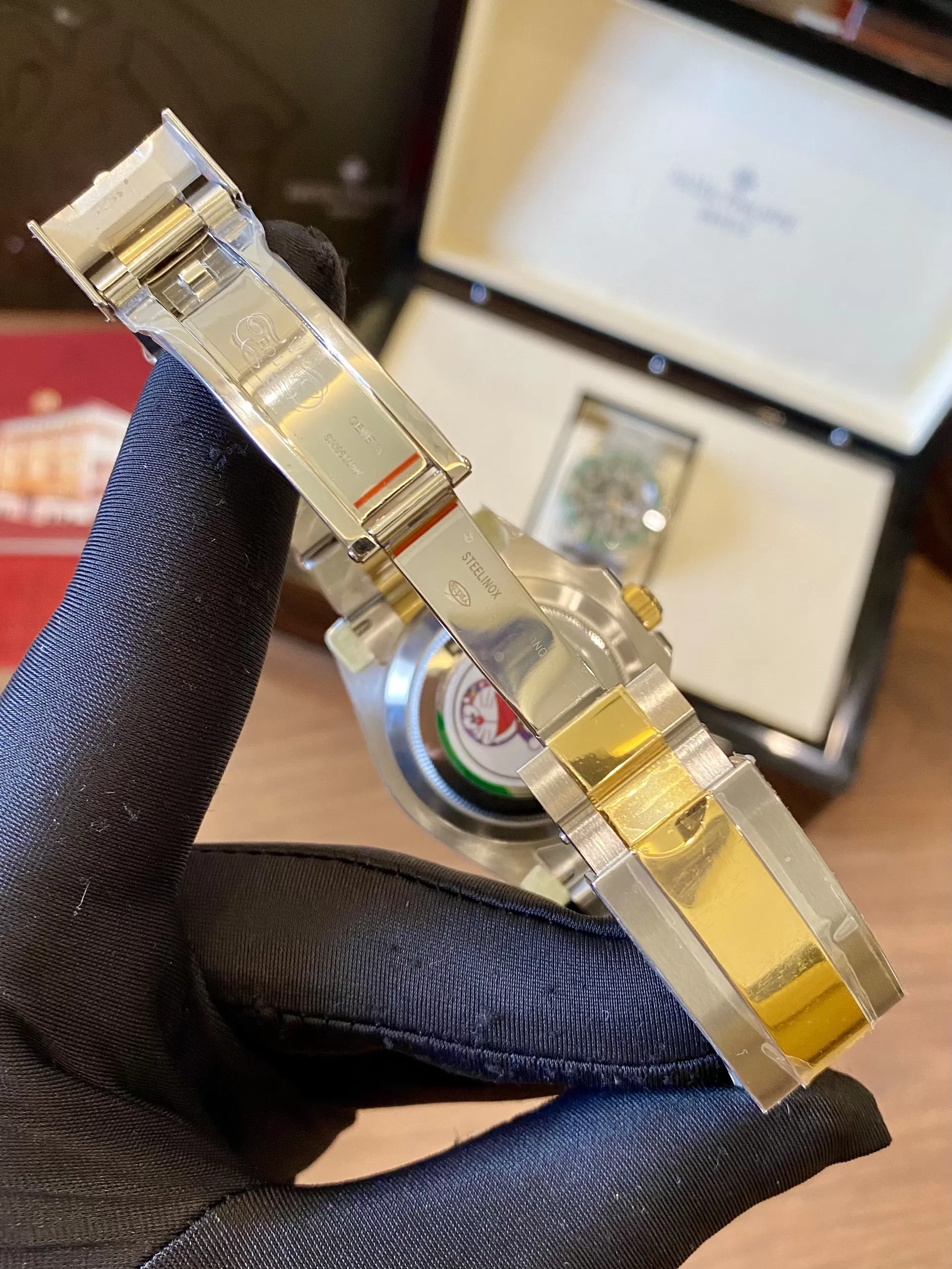 Bộ vỏ thép 316L kết hợp vàng demi 18K, cứng cáp và sang trọng. Kích thước 40mm ôm sát cổ tay, viền bezel xanh Cerachrom chống trầy, tích hợp thang đo lặn, thể hiện tinh thần Submariner chuyên nghiệp.