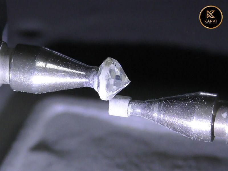 Trong quá khứ, cắt kim cương chủ yếu bằng tay với búa và đục, nhưng nay laser cho phép cắt sạch sẽ mà không tạo vết nứt. Bước này không chỉ tạo các mặt phẳng ban đầu mà còn loại bỏ phần thừa, chuẩn bị cho việc mài dũa sau. Kết quả là một viên kim cương thô sơ với hình dạng cơ bản, sẵn sàng cho các bước tinh chỉnh.