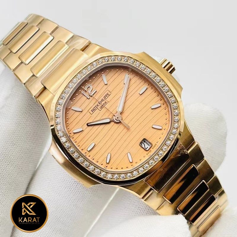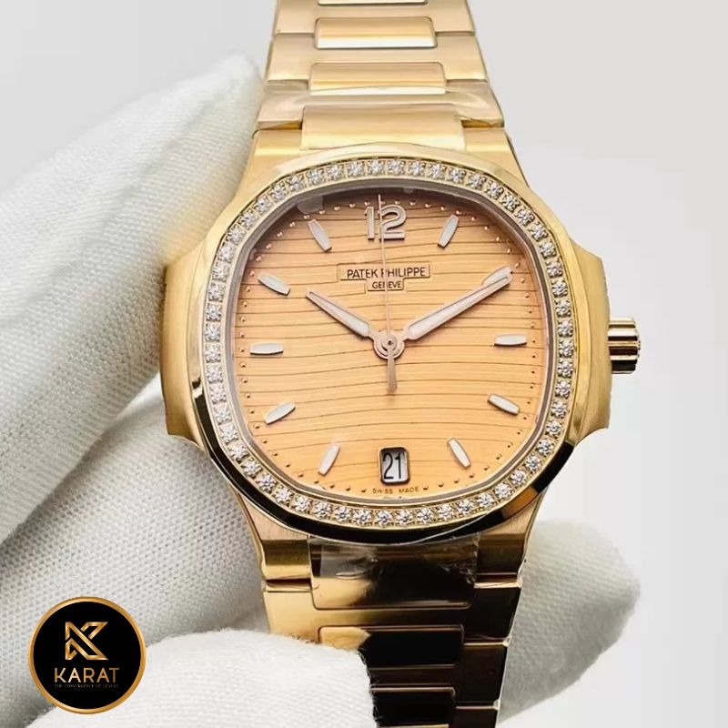 Bộ vỏ tròn bo góc đặc trưng được chế tác từ vàng hồng 18K nguyên khối – chất liệu cao cấp thường thấy ở dòng Patek nữ giới. Bezel được đính 46 viên kim cương thiên nhiên DVVS1 tỏa sáng rực rỡ dưới ánh sáng, khẳng định giá trị và độ hoàn thiện cực cao.