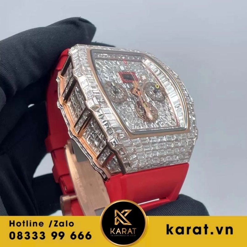 Karat.vn cung cấp Đồng hồ Richard Mille RM11-03 chế tác vàng hồng 18k đính kim cương baguette với độ hoàn thiện chuẩn 99%, kèm hộp sổ, giấy kiểm định DOJI và GIV. Ngoài ra, Karat hỗ trợ spa, lau dầu, và thu đổi sản phẩm giá tốt.