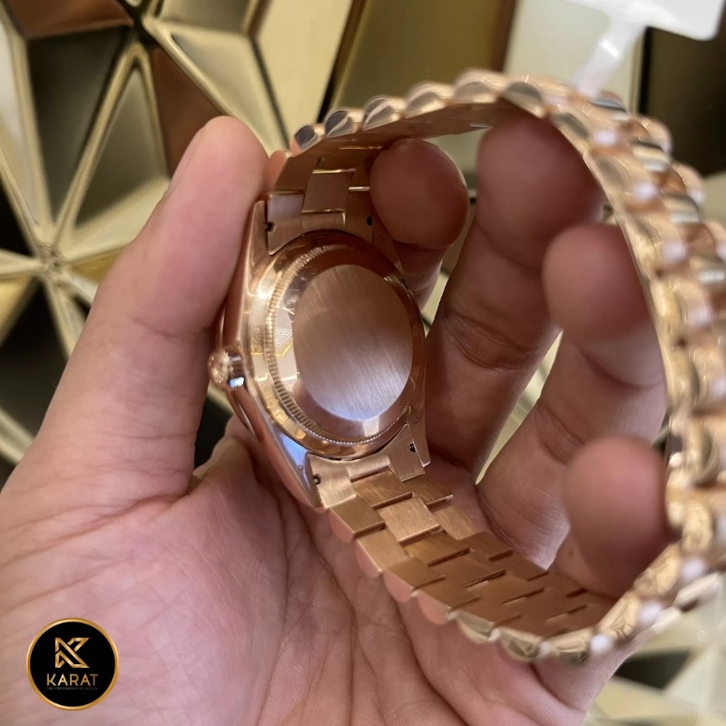 Dây đeo President 3 mắt xích từ vàng 18K nguyên khối, với mắt giữa đánh bóng đậm hơn để tăng chiều sâu thị giác. Thiết kế ôm sát cổ tay thoải mái, khóa Crownclasp gập ẩn an toàn dễ thao tác, mang lại sự tiện lợi khi sử dụng hàng ngày.