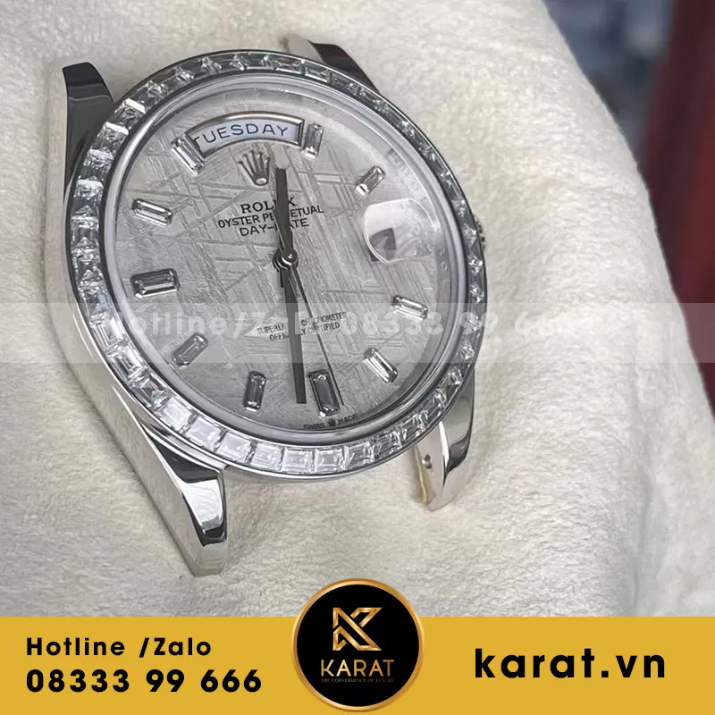 Rolex daydate 40mm chế tác vàng trắng 18k mặt thiên thạch kim cương baguette 200g