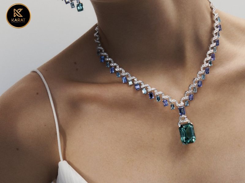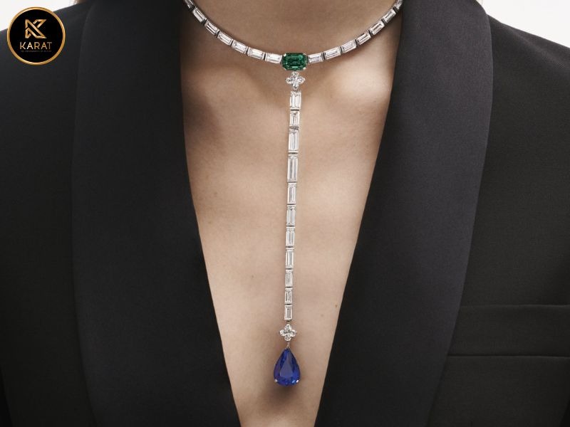 Dây chuyền Apogée trong Stellar Times gợi nhớ đến đỉnh cao của hành trình không gian, với hình dáng zig-zag gợi liên tưởng đến chữ V biểu tượng của Louis Vuitton. Món trang sức này được chế tác từ bạch kim và vàng trắng, đính 10.56 carat kim cương trung tâm cùng viên emerald 30.75 carat rực rỡ, tạo nên sự tương phản đầy mê hoặc giữa màu xanh lá và độ lấp lánh của kim cương. Thiết kế transformable cho phép đeo theo nhiều cách, từ choker ngắn đến dây dài uốn lượn, tăng tính linh hoạt cho người sử dụng.
